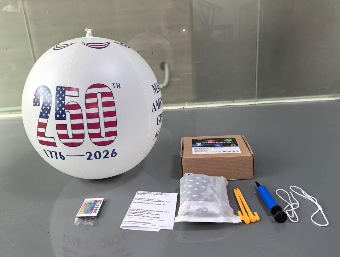 Celebrate America's 250th anniversary with this 2-pack of 16-inch inflatable glow globes, featuring solar-powered RGBW lighting for vibrant, energy-efficient illumination. Designed for versatile use, these globes can be hung, floated, or installed in-ground, making them ideal for outdoor events, decorations, or festive displays. Their solar capability ensures easy setup without wiring, while the multi-color lights add dynamic ambiance to any setting. Durable and weather-resistant, these glow globes provide lasting visual impact for your commemorations.