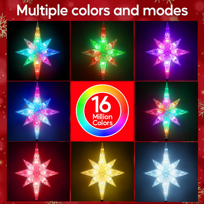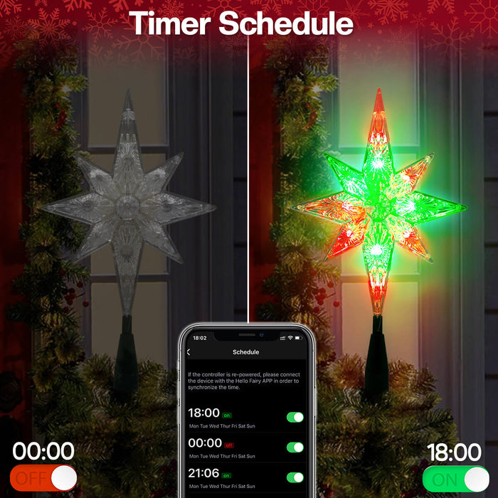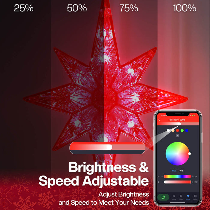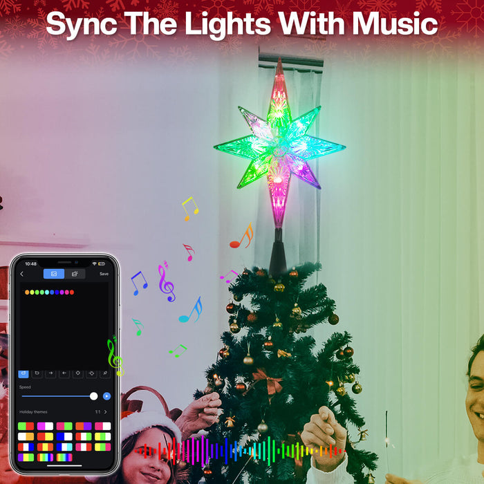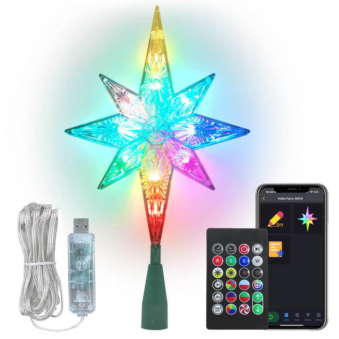 This Christmas tree topper features a Bethlehem Star design and fairy lights that can be controlled through a mobile app, with options for changing colors, playing music, and setting a timer. It also includes 58 different scene modes and is powered by USB. Add a touch of magic to your Christmas tree decoration with this 3D smart light topper.