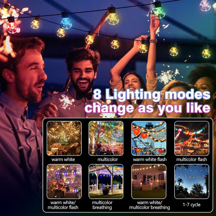- Color Changing & Warm White: Our outdoor string lights support warm white and multicolor switching with 8 dynamic lighting modes: 1. Warm White 2. Multicolor 3. Warm White Flash 4. Multicolor Flash 5. Warm White/Multicolor Flash 6. Multicolor Breathing 7. Warm White/Multicolor Breathing 8. 1-7 Cycle.