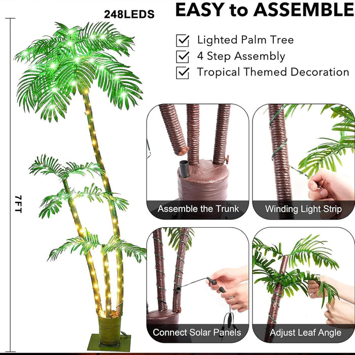 - HIGH QUALITY & DURABLE MATERIALS -- There are two options for palm tree lights: 6FT 220LEDS and 7FT 248LEDS.The base of the tree is sturdy and stable, and the top is made of bright palm leaves, with durable LED light beads tied to it.Just connect each part of the tree trunk one by one, and you will get a magical outdoor artificial palm tree light, which is very easy to install.