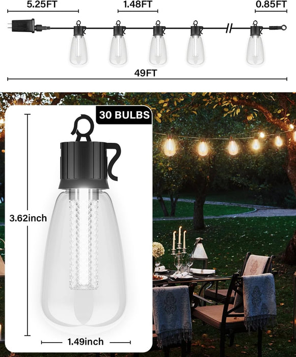 Illuminate your outdoor space with our 49FT string lights, featuring 30 shatterproof ST38 bulbs in multicolor and warm white. Control the ambiance with the included remote, allowing for dimming and timer settings. Perfect for adding a cozy and festive touch to your porch, backyard, or pergola.