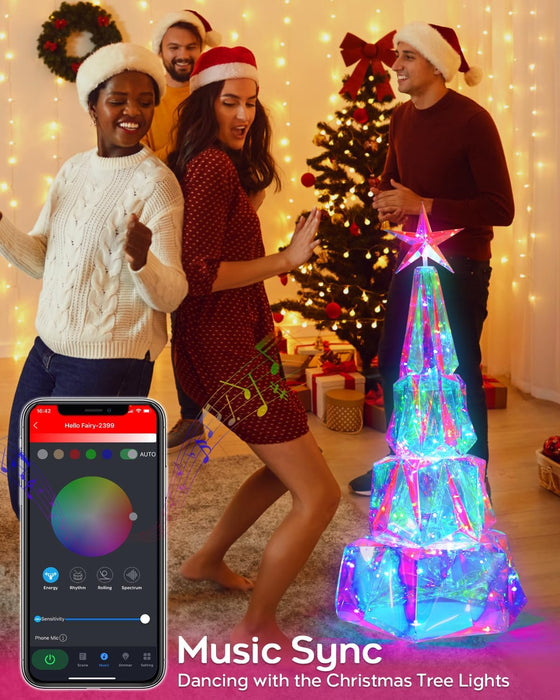 This 3.6FT Prismatic Iridescent Christmas tree offers a DIY color-changing experience with smart app control and a chasing effect. The LED folding tree is perfect for indoor holiday decorations, with music synchronization adding to the festive atmosphere.