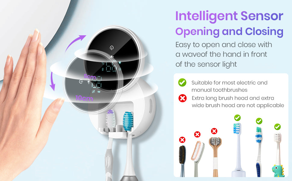 This must-have Smart Toothbrush UV Sanitizer Wall Mounted Holder & Cleaner is a must for every bathroom. It's complete with an Electric Toothbrush Holder, Razor Holder, and Cleaner, making it the perfect accessory. Its Auto Inductive Open/Close Cover allows for effortless and hygienic use, providing a tidy and dry storage area for your toothbrushes at home and on the go. This product effortlessly keeps your toothbrushes organized and sanitized.