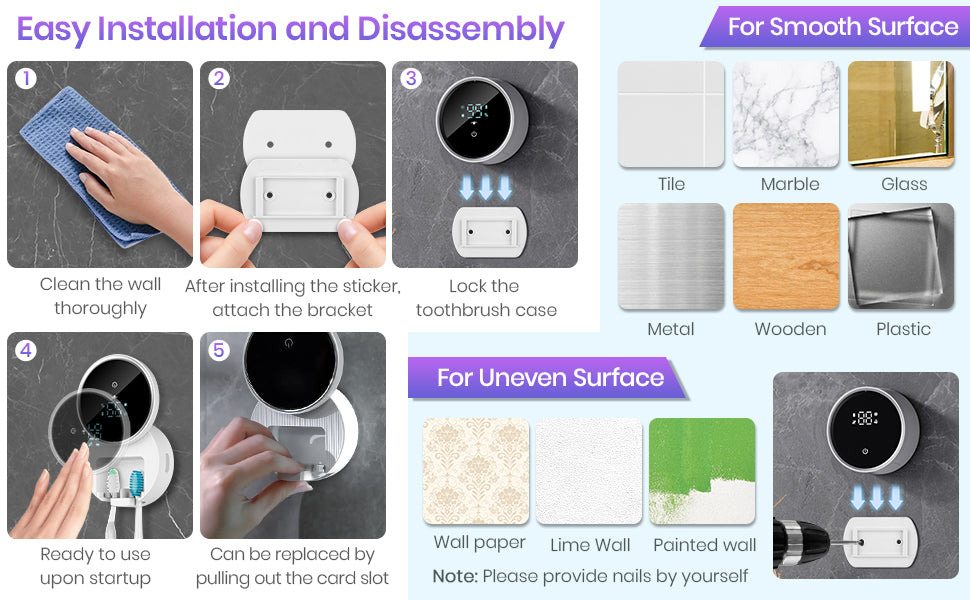 - Inductive: One hand control to open/close the lid, truly contactless.The toothbrush holder can be easily installed on smooth surfaces such as walls or mirrors using sturdy tape.