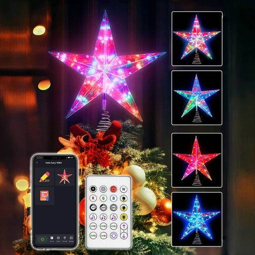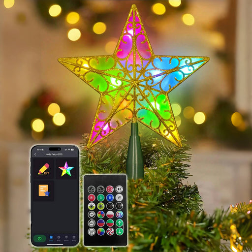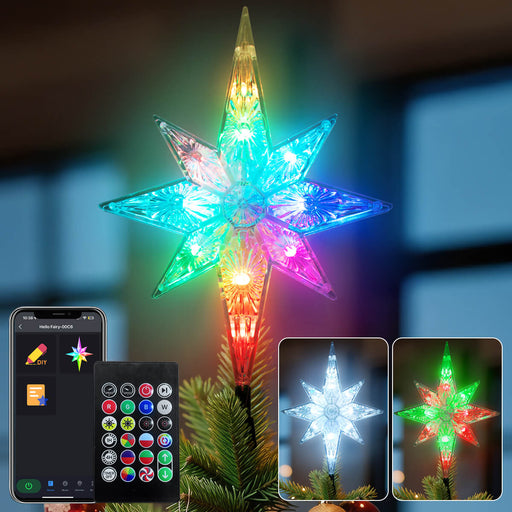 This Christmas tree topper features a Bethlehem Star design and fairy lights that can be controlled through a mobile app, with options for changing...